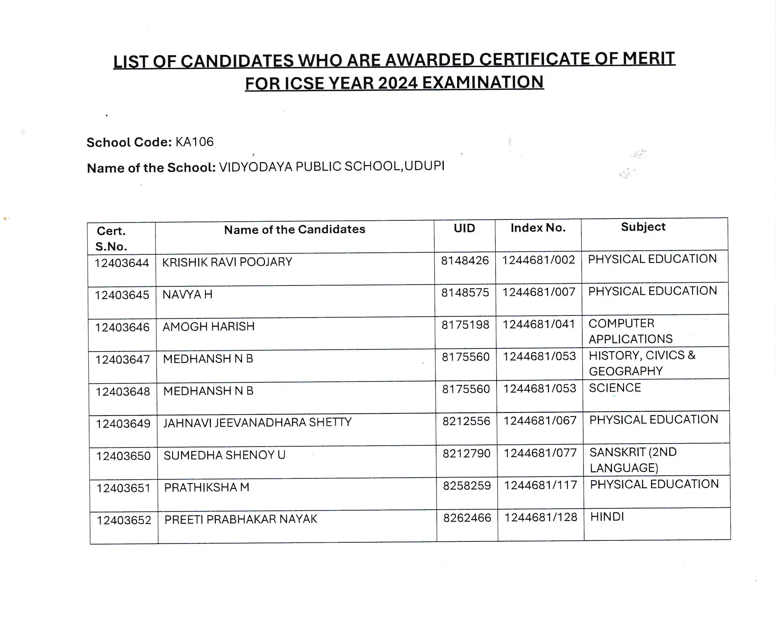 At Vidyodaya Public School, excellence is not just a goal—it’s a tradition. This year, we are thrilled to announce that eight of our outstanding students have been recognized with the prestigious Certificate of Merit by the Council for the Indian School Certificate Examinations (CISCE). This remarkable achievement underscores the dedication, hard work, and academic prowess of our students across nine subjects.